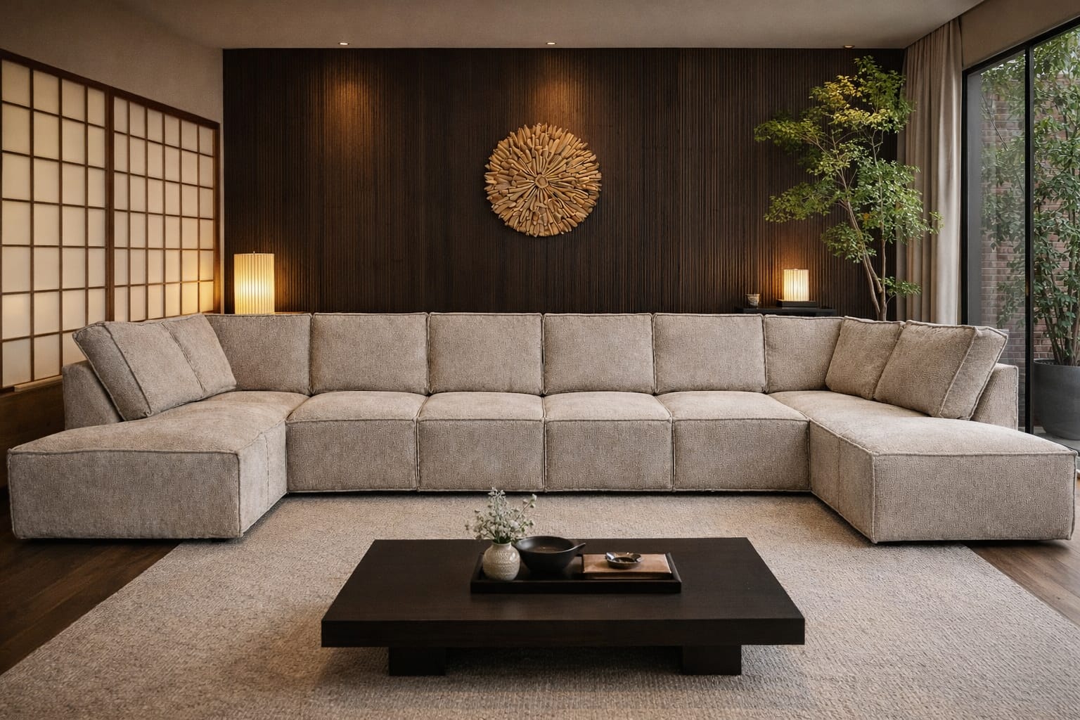 De XXL U-bank heeft een complete breedte van 488 cm, twee delen van 212 met een zitdiepte van 60 cm, perfect voor het hele gezin! De zithoogte is 40 cm en de hoogte van de bank is 83 cm. Bij deze opstelling zijn links en rechts beide 212cm. Deze Mega XXL U bank heeft een elementenlook. Dit wil zeggen dat het lijkt of alle zitvlakken modulair zijn, deze zijn echter allemaal vast.